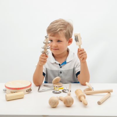 16-delni set ritmičnih glasbil v priročni torbici za shranjevanje, s pomočjo katerega lahko otrok raziskuje svet ritma in zvokov!